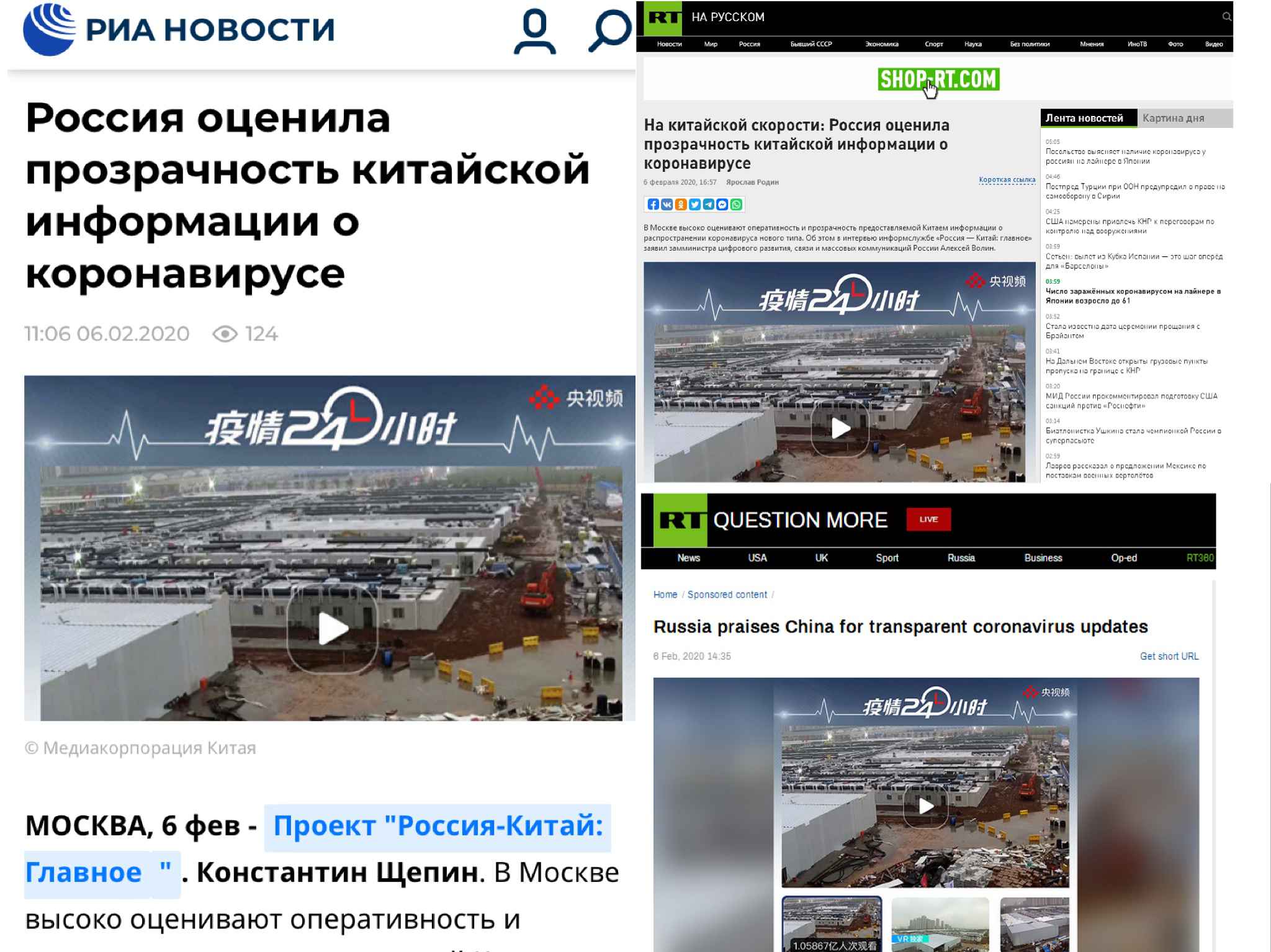 《俄罗斯报》网站6日刊发题为《中国政府发布疫情和防控信息及时透明》的文章称,俄罗斯认为中国发布疫情和防控信息及时透明,通过中央广播电视总台央视频慢直播引来过亿网民化身“云监工”,助推疫情防控在全民舆论监督下高效运行。俄新社、RT电视台俄文和英文网站等俄主流媒体纷纷转载这一文章。